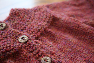 The other modification was that I omitted the gull lace pattern that is supposed to be on the body and arms of the sweater. Since I'm not sure if this little one is going to a yet-to-be born boy or girl I thought this would be a nice compromise. I love the look and color and think it will suit either nicely. The buttons are hand-carved coconut and sewn on with matching thread.